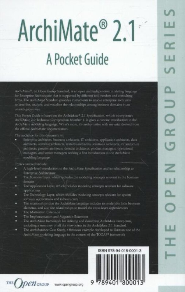 ArchiMate®, an Open Group Standard, is an open and independent modeling language for Enterprise Architecture that is supported by different tool vendors and consulting firms. ArchiMate provides instruments to enable enterprise architects to describe, analyze, and visualize the relationships among business domains in an unambiguous way. This Pocket Guide is based on ArchiMate® 2.1. It gives a concise introduction to ArchiMate. Whats more, its authoritative with material derived from the official ArchiMate documentation.