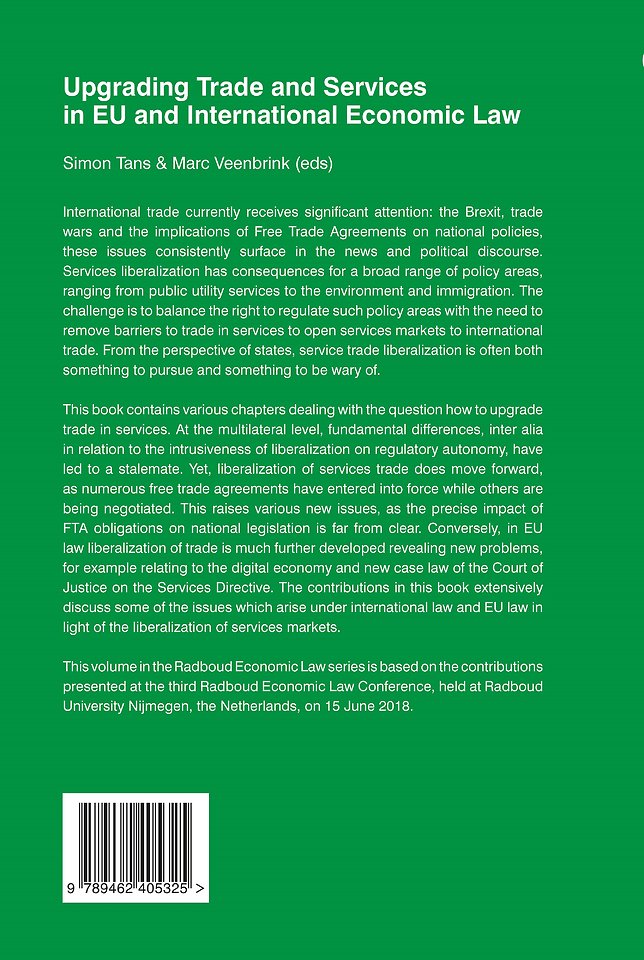 This book contains various chapters dealing with the question how to upgrade trade in services. At the multilateral level, fundamental differences, inter alia in relation to the intrusiveness of liberalization on regulatory autonomy, have led to a stalemate. Yet, liberalization of services trade does move forward, as numerous free trade agreements have entered into force while others are being negotiated. This raises various new issues, as the precise impact of FTA obligations on national legislation is far from clear. Conversely, in EU law liberalization of trade is much further developed revealing new problems, for example relating to the digital economy and new case law of the Court of Justice on the Services Directive. The contributions in this book extensively discuss some of the issues which arise under international law and EU law in light of the liberalization of services markets.