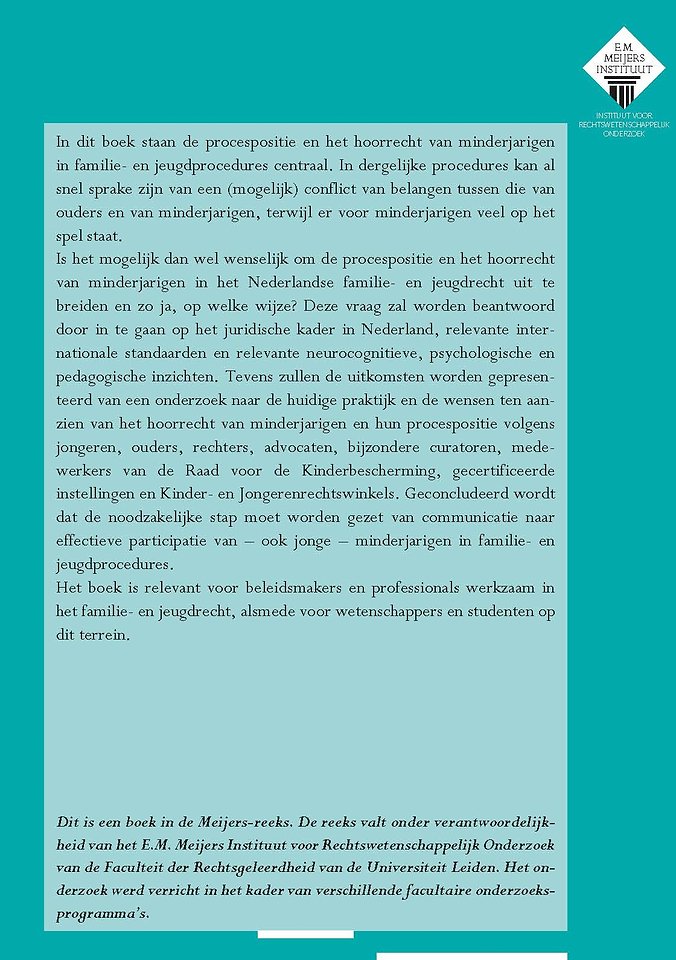 In dit boek staan de procespositie en het hoorrecht van minderjarigen in familie- en jeugdprocedures centraal. In dergelijke procedures kan al snel sprake zijn van een (mogelijk) conflict van belangen tussen die van ouders en van minderjarigen, terwijl er voor minderjarigen veel op het spel staat.