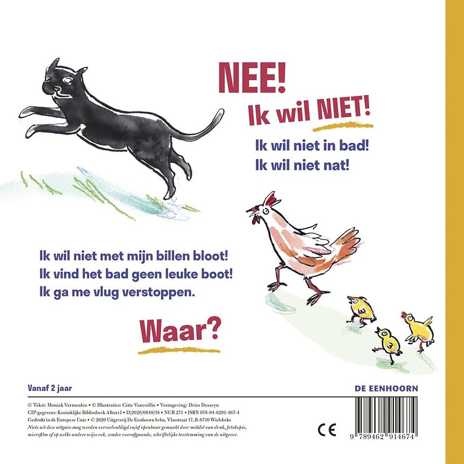 Broer en zus willen niet in bad. Nat is niet leuk! Bloot is niet fijn! Ze verstoppen zich eerst onder het bed. Maar daar ligt het vol kriebelende pluisjes. In de vogelkooi hebben ze last van de rondfladderende veertjes en op zolder hangen ze al snel vol met spinnenwebben. Op elke verstopplek worden de peuters een beetje smeriger. Willen ze nog steeds niet in bad?
