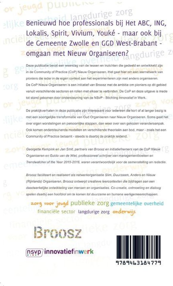 De praktijkverhalen in deze publicatie zijn interessant voor iedereen die kort of al langer bezig is met een soortgelijke transformatie van Oud Organiseren naar Nieuw Organiseren. Soms gaat het over eigen worstelingen en persoonlijke stappen, dan weer over een gekozen veranderaanpak. Ook komen ondersteunende modellen en verschillende theorieën aan bod, maar - zoals het een Community of Practice betaamt - steeds is daarbij de praktijk leidend.