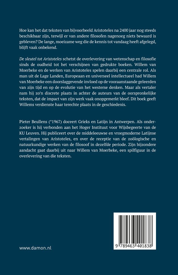 'De sleutel tot Aristoteles' schetst de overlevering van wetenschap en filosofie sinds de oudheid tot het verschijnen van gedrukte boeken. Willem van Moerbeke en de werken van Aristoteles spelen daarbij een centrale rol. Als man uit de Lage Landen, Europeaan en universeel intellectueel had Willem van Moerbeke een doorslaggevende invloed op de vooraanstaande geleerden van zijn tijd en op de evolutie van het westerse denken. Maar als vertaler nam hij zo'n discrete plaats in achter de auteurs van de oorspronkelijke teksten, dat de impact van zijn werk vaak onopgemerkt bleef. Dit boek geeft Willems verdienste haar terechte plaats in de geschiedenis.