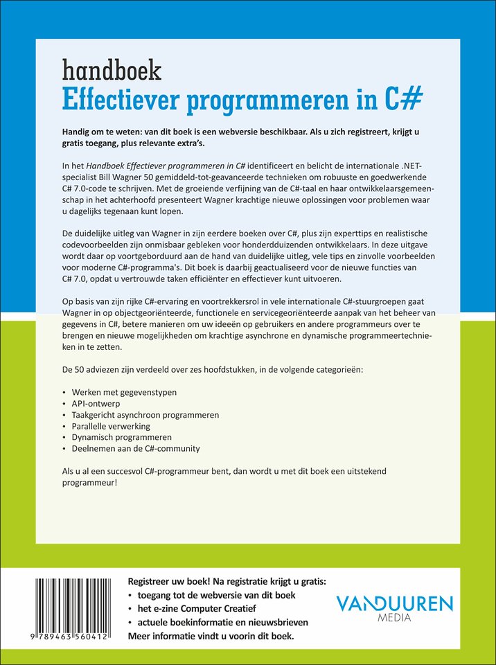 De duidelijke uitleg van Wagner in zijn eerdere boeken over C#, plus zijn experttips en realistische codevoorbeelden zijn onmisbaar gebleken voor honderdduizenden ontwikkelaars. In deze uitgave wordt daar op voortgeborduurd aan de hand van duidelijke uitleg, vele tips en zinvolle voorbeelden voor moderne C#-programma's. Dit boek is daarbij geactualiseerd voor de nieuwe functies van C# 7.0, opdat u vertrouwde taken efficiënter en effectiever kunt uitvoeren.
