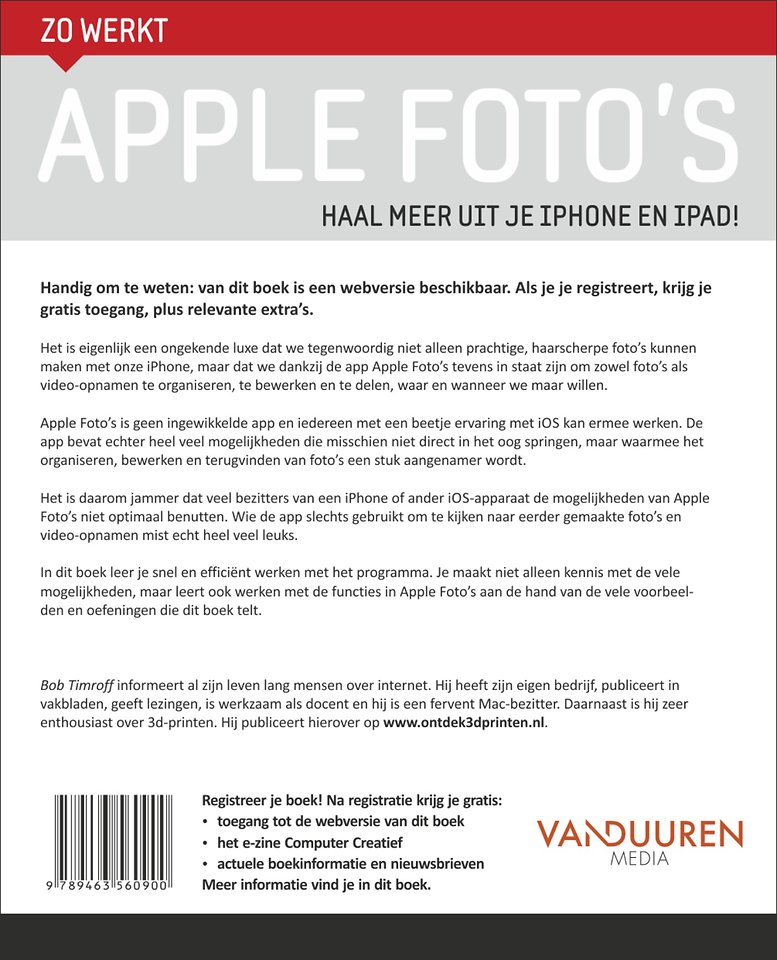 In dit boek leer je snel en efficiënt werken met het programma. Je maakt niet alleen kennis met de vele mogelijkheden, maar leert ook werken met de functies in Apple Foto’s aan de hand van de vele voorbeelden en oefeningen die dit boek telt.