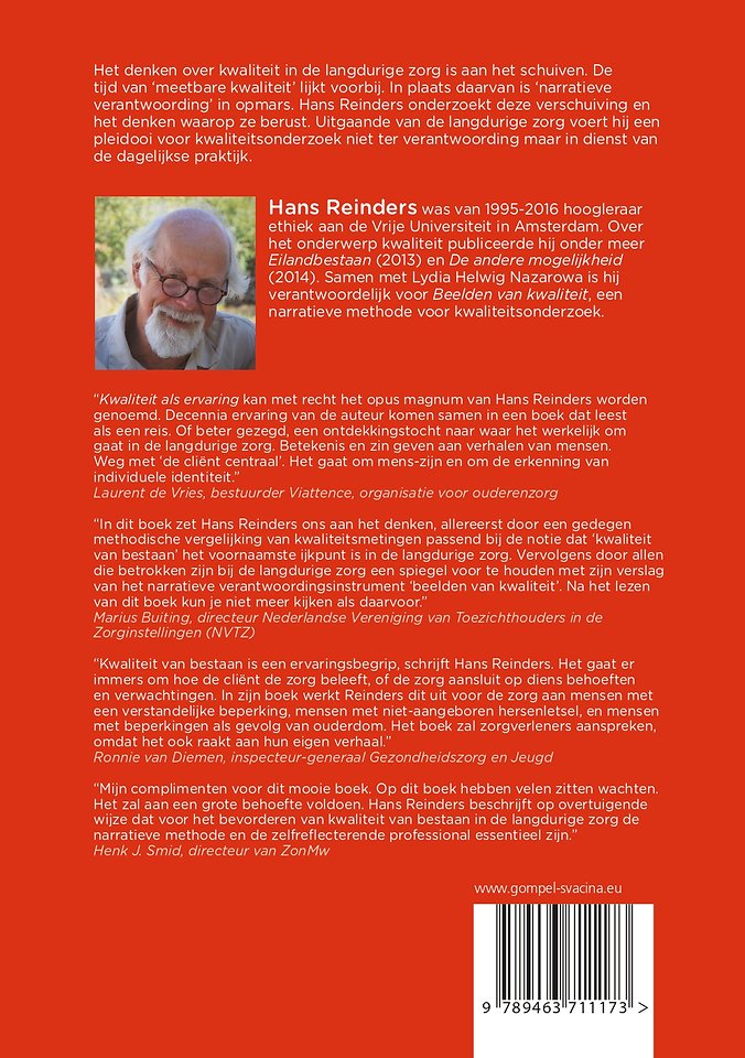 “In dit boek zet Hans Reinders ons aan het denken, allereerst door een gedegen methodische vergelijking van kwaliteitsmetingen passend bij de notie dat ‘kwaliteit van bestaan’ het voornaamste ijkpunt is in de langdurige zorg. Vervolgens door allen die betrokken zijn bij de langdurige zorg een spiegel voor te houden met zijn verslag van het narratieve verantwoordingsinstrument ‘beelden van kwaliteit’. Na het lezen van dit boek kun je niet meer kijken als daarvoor.” - Marius Buiting, directeur Nederlandse Vereniging van Toezichthouders in de Zorginstellingen (NVTZ)