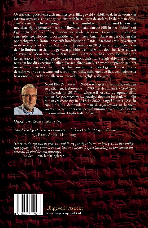 Overal waar godsdienst zich manifesteert, lijkt geweld vlakbij. Vaak in de vorm van extreme agressie als de ene godsdienst zich keert tegen de andere. In de roman Zoons zonder vader vlucht een jonge, in zijn leven mislukte zoon door middel van het noviciaat bij de jezuïeten naar El Minya, een stad aan de Nijl in het midden van Egypte. In El Minya treft hij de laatste twee verdedigers van het ware Roomse geloof in een verder leeg klooster. Door middel van een reeks Amarnabrieven, gericht aan zijn opdrachtgever in Rome, beschrijft hoofdpersoon Daniël Hazebroek zijn ervaringen in de woelige stad aan de Nijl. Het is de zomer van 2013. Er zijn opstanden van de Moslimbroederschap, de gekozen president Morsi wordt door het leger afgezet en vervangen door generaal al-Sisi. Daniël hoort de verhalen over Echnaton, de ketterfarao die 3500 jaar geleden de eerste monotheïstische religie afdwong en komt te weten hoe dit experiment afliep. De actualiteit van 2013 wordt gespiegeld aan het meest bijzondere moment in de geschiedenis van het Oude Egypte. Citaat: ‘Zodra de claim voor de ene, ware god wordt ingebracht, mijn zoon, verliest een godsdienst haar onschuld en kan zij alleen met geweld haar gelijk verkrijgen.’