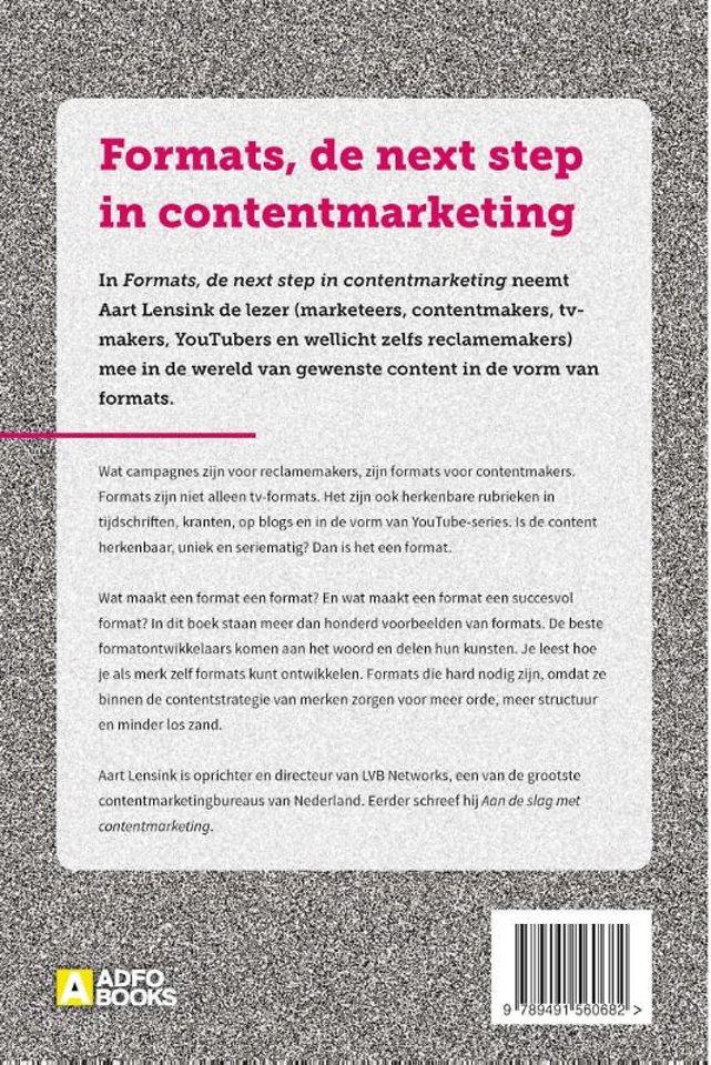 Wat maakt een format een format? En wat maakt een format een succesvol format? In dit boek staan meer dan honderd voorbeelden van formats. De beste formatontwikkelaars komen aan het woord en delen kun kunsten. Je leest hoe je als merk zelf formats kunt ontwikkelen. Formats die hard nodig zijn, omdat ze binnen de contentstrategie van merken zorgen voor meer orde, meer structuur en minder los zand.