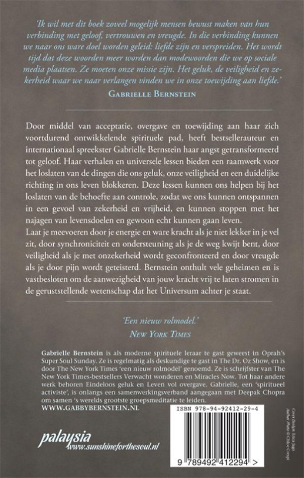 Door middel van acceptatie, overgave en toewijding aan haar zich voortdurend ontwikkelende spirituele pad, heeft bestsellerauteur en internationaal spreekster Gabrielle Bernstein haar angst getransformeerd tot geloof. Haar verhalen en universele lessen bieden een raamwerk voor het loslaten van de dingen die ons geluk, onze veiligheid en een duidelijke richting in ons leven blokkeren. Deze lessen kunnen ons helpen bij het loslaten van de behoefte aan controle, zodat we ons kunnen ontspannen in een gevoel van zekerheid en vrijheid, en kunnen stoppen met het najagen van levensdoelen en gewoon echt kunnen gaan leven.