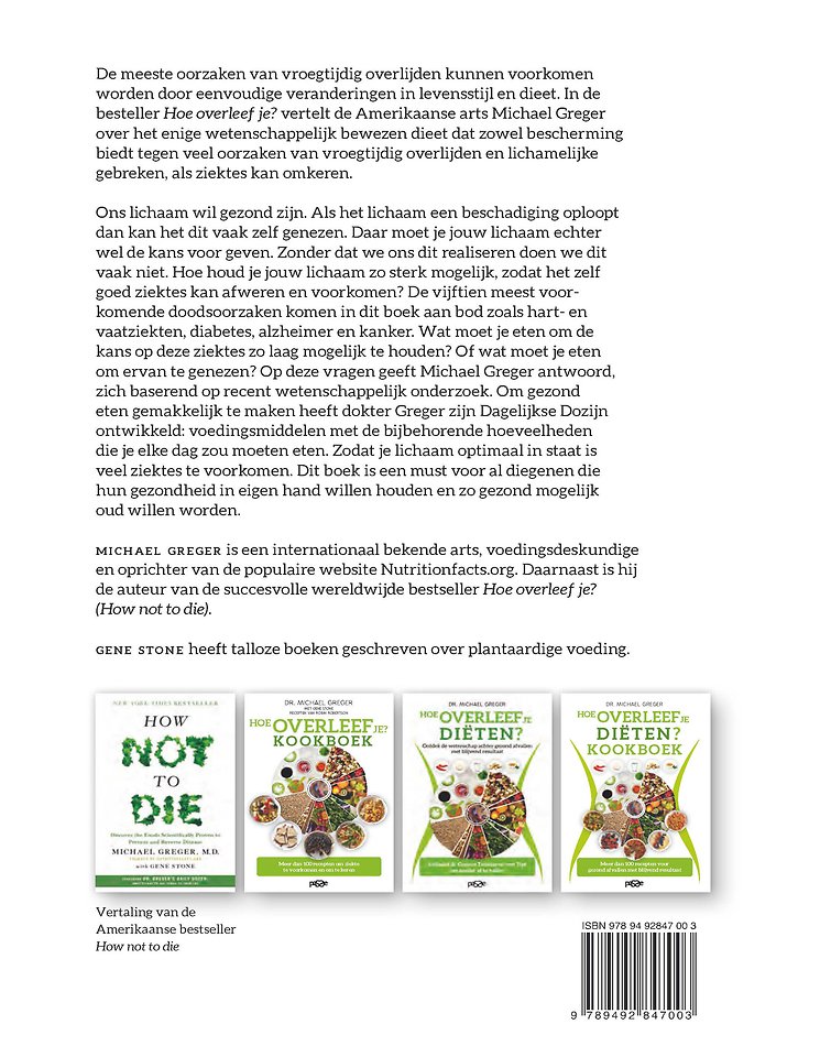 De meeste oorzaken van vroegtijdig overlijden kunnen voorkomen worden door eenvoudige veranderingen in levensstijl en dieet. In de besteller Hoe overleef je? vertelt de Amerikaanse arts Michael Greger over het enige wetenschappelijk bewezen dieet dat zowel bescherming biedt tegen veel oorzaken van vroegtijdig overlijden en lichamelijke gebreken, als ziektes kan omkeren.