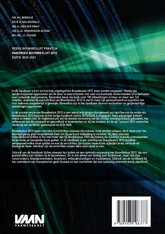 In dit handboek is kort en krachtig uitgelegd hoe Bouwbesluit 2012 moet worden toegepast. Hierbij zijn aandachtspunten opgenomen om de lezer te waarschuwen voor veel voorkomende misverstanden of te behoeden voor verkeerde interpretaties. Bovendien bevat het boek ruim 180 afbeeldingen in kleur en meer dan 165 tabellen, waarmee de voorschriften van Bouwbesluit 2012 in sterke mate zijn gevisualiseerd en waardoor het voor iedereen toegankelijk is gemaakt. Bovendien zijn in het handboek diverse voorbeelden en gelijkwaardige oplossingen opgenomen.
