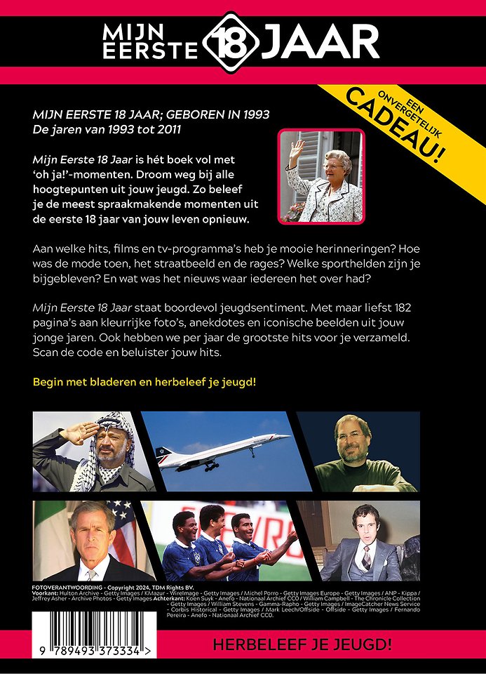 Mijn Eerste 18 Jaar staat boordevol jeugdsentiment. Met maar liefst 182 pagina’s aan kleurrijke foto’s, anekdotes en iconische beelden uit jouw jonge jaren. Ook hebben we per jaar de grootste hits voor je verzameld. Scan de code en beluister jouw hits.