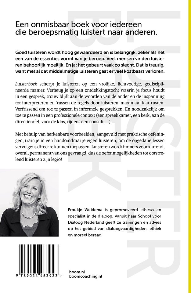 Meer over Froukje WeidemaEen onmisbaar boek voor iedereen die beroepsmatig luistert naar anderen • Scherpt je luisteren op een vrolijke, lichtvoetige maar ook gedisciplineerde manier • Diepgaand én direct praktisch toepasbaar in het dagelijks leven • Inclusief bijbehorende podcasts ter verdieping Iedereen luistert, mits je daartoe fysiek in staat bent. Het maakt niet uit of je dat professioneel doet of privé. Luisteren wordt doorgaans hoog gewaardeerd – en in professionele zin vereist – maar wat omvat die vaardigheid nu precies? Dit boek scherpt je luisteren op een vrolijke, lichtvoetige, en toch gedisciplineerde manier. Verheug je op een ontdekkingstocht waarin je trouw blijft aan de woorden van de ander, alle inspanning tot interpreteren en ‘tussen de regels door luisteren’ maximaal laat rusten, en focus houdt in een gesprek. Verfrissend om toe te passen in een informeel gesprek en noodzakelijk in een professionele context (een spreekkamer, een kerk, aan de directietafel, voor de klas, tijdens een consult …). Aan de hand van praktische oefeningen train je in een handomdraai je eigen luisteren, om de opgedane lessen vervolgens direct te kunnen toepassen. Luisteren wordt immers voortdurend, overal, permanent van ons gevraagd, dus de oefenmogelijkheden zijn legio! Froukje Weidema is gepromoveerd ethicus en specialist in de dialoog. Vanuit haar School voor Dialoog Nederland geeft ze trainingen en advies op het gebied van dialoogvaardigheden, ethiek en moreel beraad.