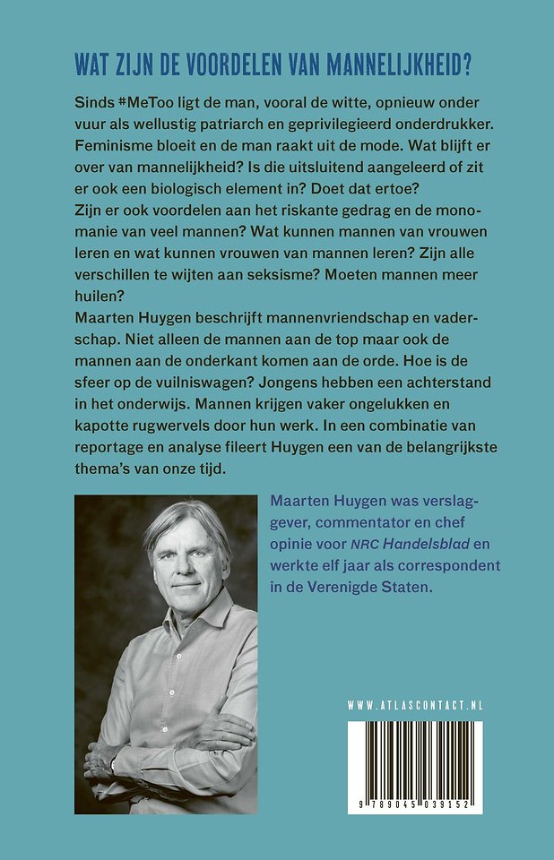Maarten Huygen beschrijft mannenvriendschap, vaderschap, de achterstand van jongens in het onderwijs. Niet alleen de mannen aan de top maar ook de mannen aan de onderkant komen aan de orde. Hoe is de sfeer op de vuilniswagen? Over de sterke kanten van de nerd en het privilege van kapotte rugwervels.