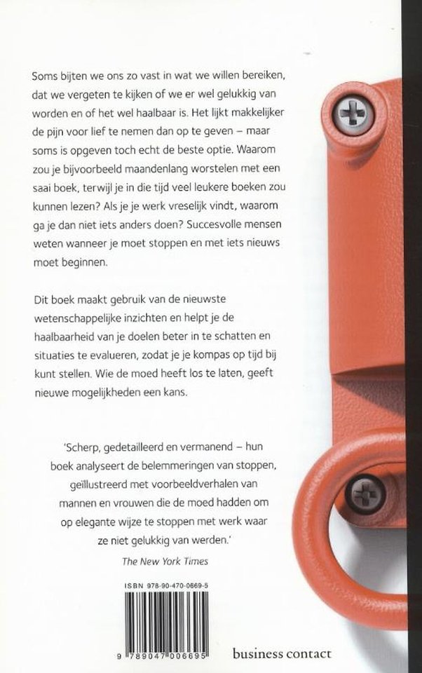 Dit boek maakt gebruik van de nieuwste wetenschappelijke inzichten en helpt u de haalbaarheid van uw doelen beter in te schatten en situaties te evalueren, zodat u uw kompas op tijd bij kunt stellen. Wie de moed heeft los te laten, geeft nieuwe mogelijkheden een kans.
