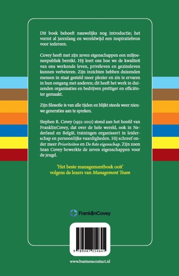 Covey heeft met zijn zeven eigenschappen een miljoenenpubliek bereikt. Hij leert ons hoe we de kwaliteit van ons werkende leven, privé-leven en gezinsleven kunnen verbeteren. Zijn inzichten hebben duizenden mensen in staat gesteld meer plezier en zin te ervaren in hun omgang met anderen; dit heeft het werk in duizenden organisaties en bedrijven prettiger en effectiever gemaakt. Zijn filosofie is van alle tijden en blijkt steeds weer nieuwe generaties aan te spreken. Nu in nieuwe vertaling!