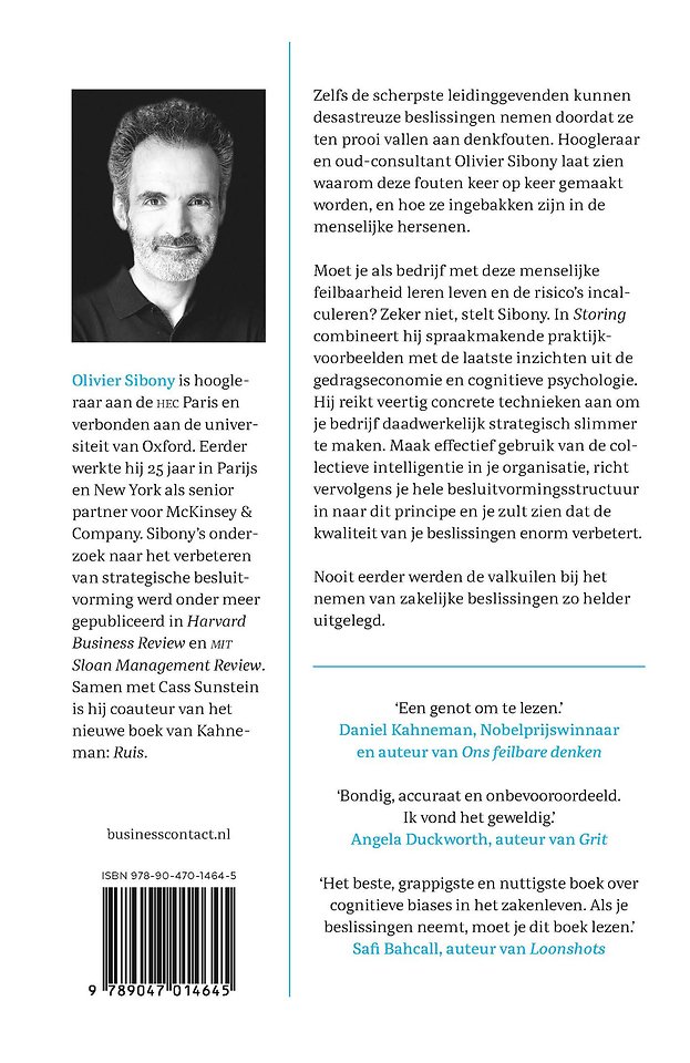 Meer over Olivier SibonyIn 'Storing' laat hoogleraar en oud-consultant Olivier Sibony zien dat zelfs de scherpste leidinggevenden desastreuze beslissingen kunnen nemen doordat ze ten prooi vallen aan denkfouten, waarom deze fouten keer op keer gemaakt worden, en hoe ze ingebakken zijn in de menselijke hersenen.