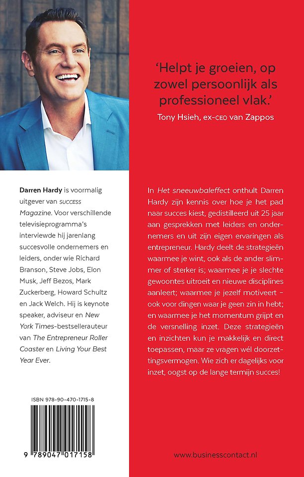 In 'Het sneeuwbaleffect' onthult hij de strategieën waarmee je wint, ook als de ander slimmer of sterker is; waarmee je je slechte gewoontes uitroeit en nieuwe disciplines aanleert; waarmee je jezelf motiveert – ook voor dingen waar je geen zin in hebt; en waarmee je momentum grijpt en de versnelling inzet. Dit boek zit boordevol heldere inzichten en strategieën die je makkelijk en direct kunt toepassen, maar die wél doorzettingsvermogen vragen. Wie zich er dagelijks voor inzet, oogst op de lange termijn succes!