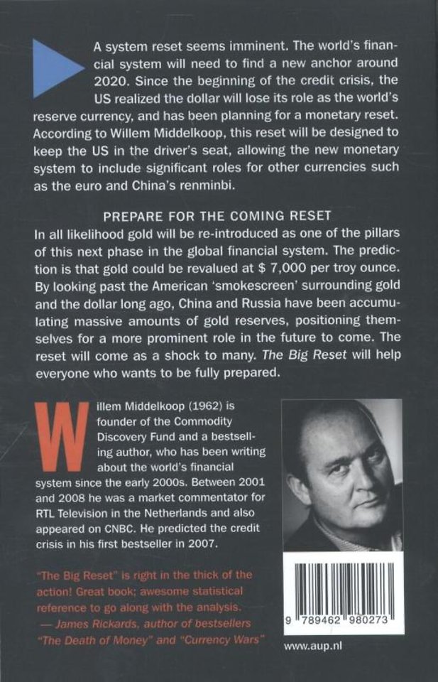 In zijn nieuwste boek, 'The Big Reset', beschrijft Middelkoop de historie en problemen van ons huidige financiële systeem en onthult hij hoe we voor 2020 zullen overgaan naar een nieuw systeem. Goud heeft als enige valuta de afgelopen eeuwen haar koopkracht behouden. Bankiers proberen de vlucht naar goud al tientallen jaren af te remmen maar lijken deze War on Gold nu te verliezen.