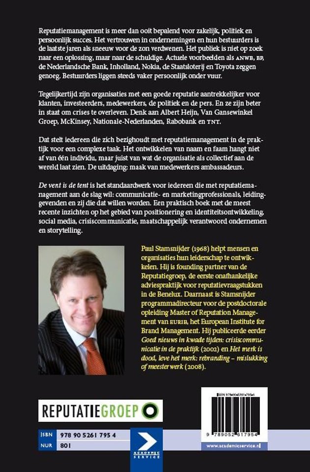 'De vent is de tent' is een optimistische inwijding in de geheimen van reputatiemanagement. Het is een oproep om de slag te maken van management naar leiderschap, van mannelijk naar vrouwelijk denken en van zakelijkheid naar zingeving. Aan de hand van tientallen voorbeelden toont de auteur hoe leiders vanuit een positieve aanpak kunnen bouwen aan respect bij alle stakeholders van hun organisatie. Wie dit boek heeft gelezen kan er direct mee aan de slag, kent de do's en don'ts en doorziet de betekenis van internet en social media op het bedrijfsleven.