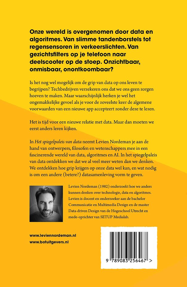 In Het Spiegelpaleis van data neemt Levien Nordeman je aan de hand van ontwerpers, filosofen en wetenschappers mee in een fascinerende wereld van data, algoritmes en AI. In het spiegelpaleis van data ontdekken we dat we al veel meer weten dan we denken. We ontdekken hoe grip krijgen op onze data wél kan, en wat nodig is om een andere en betere datasamenleving vorm te geven.