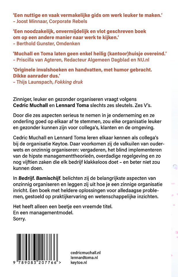 In Bedrijf. Bamischijf. belichten zij de belangrijkste aspecten van onzinnig organiseren en leggen zij uit hoe je een zinnige organisatie inricht. Een boek met heldere oplossingen voor alledaagse problemen, gestoeld op praktijkervaring en wetenschappelijke inzichten. Het heeft alleen een beetje een vreemde titel. En een managementmodel. Sorry.