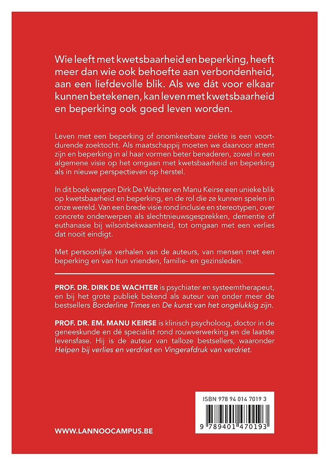 In dit boek kijken beide auteurs precies naar het leven met kwetsbaarheid en beperking. Dagelijks geconfronteerd worden met de grenzen van wat kan en wat niet (meer) mogelijk is, is erg confronterend voor alle betrokkenen. Door beter te luisteren naar mensen met een beperking zelf, hun familieleden en hulpverleners komen ze tot een nieuwe kijk op beperking.