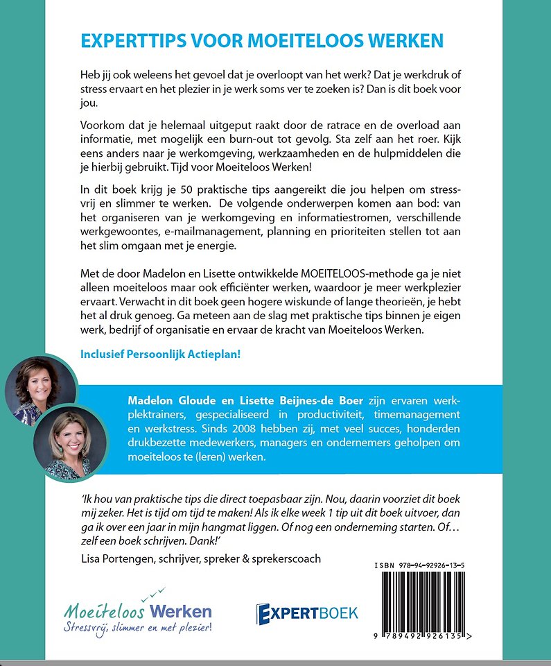 Met de door Madelon en Lisette ontwikkelde MOEITELOOS-methode ga je niet alleen moeiteloos maar ook efficiënter werken, waardoor je meer werkplezier ervaart. Verwacht in dit boek geen hogere wiskunde of lange theorieën, je hebt het al druk genoeg. Ga meteen aan de slag met praktische tips binnen je eigen werk, bedrijf of organisatie en ervaar de kracht van Moeiteloos Werken.